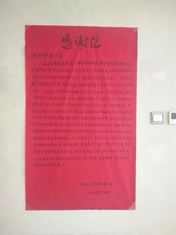 趙小平說:“8月8日中午,我駕駛貨車途徑柳林白崖河,由于突降暴雨、河水猛漲,洪水將我連人帶車掀翻至河中,我被困在駕駛室,當(dāng)時(shí)生命和財(cái)產(chǎn)受到了嚴(yán)重威脅。這時(shí),貴公司王小龍立即向我伸出援手,在第一時(shí)間組織工地挖機(jī)、鏟車等機(jī)械,連同岳克斌、岳涵、陳興銀等員工一起,順利將我救上岸,并及時(shí)控制了我的貨車沒有陷的更深。在此我表示深深地謝意,感謝貴公司為社會(huì)培養(yǎng)這么好的優(yōu)秀人才,愿幫助我的幾位好心人身體健康、家庭和睦、事業(yè)順利,愿貴公司生意興隆!