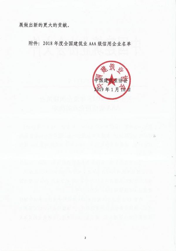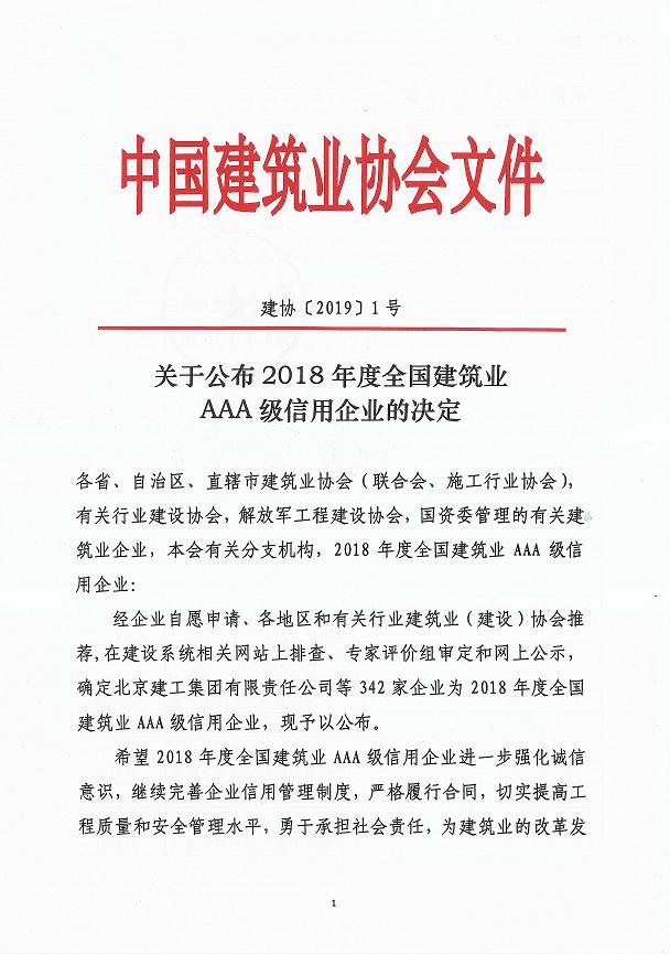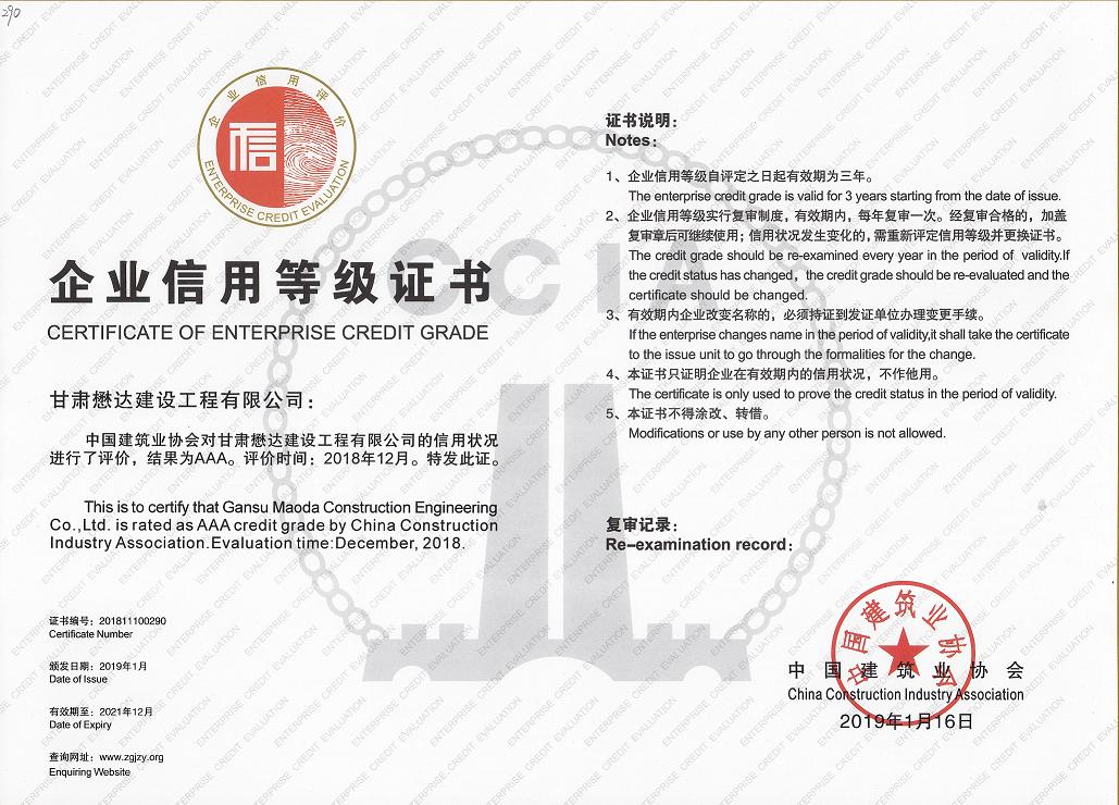 近日,中國建筑業(yè)協(xié)會(huì)公布了2018年度全國建筑業(yè)AAA級(jí)信用企業(yè)評(píng)價(jià)結(jié)果,甘肅懋達(dá)建設(shè)工程有限公司獲評(píng)“2018年度全國建筑業(yè)AAA級(jí)信用企業(yè)”榮譽(yù)稱號(hào)。