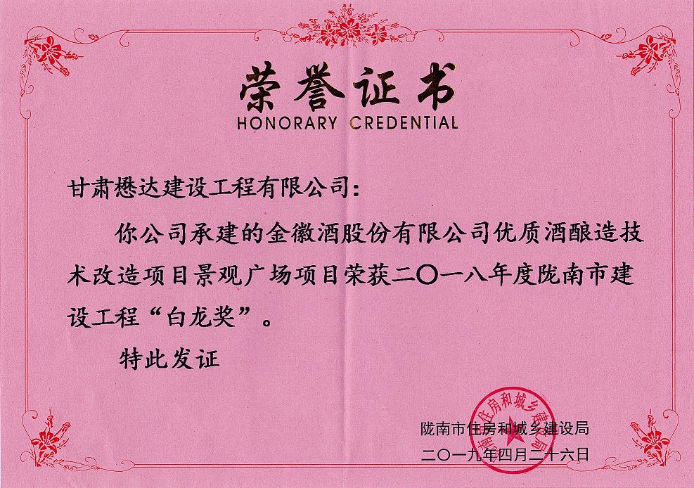 近日,在隴南市2019年建設(shè)工程質(zhì)量安全監(jiān)管工作視頻會議上,公司承建的金徽酒股份有限公司優(yōu)質(zhì)酒釀造技術(shù)改造項(xiàng)目景觀廣場項(xiàng)目榮獲2018年度隴南市建設(shè)工程“白龍獎”。