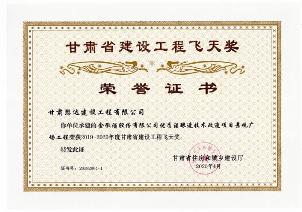 近日,甘肅省住房和城鄉(xiāng)建設(shè)廳關(guān)于2019-2020年度(第一批)甘肅省建設(shè)工程飛天金獎(jiǎng)和飛天獎(jiǎng)入選名單公示已經(jīng)結(jié)束,公司共有兩個(gè)項(xiàng)目榮獲甘肅省建設(shè)工程飛天獎(jiǎng)。其中,金徽財(cái)富中心項(xiàng)目榮獲飛天金獎(jiǎng),金徽酒股份有限公司優(yōu)質(zhì)酒釀造技術(shù)改造項(xiàng)目景觀廣場(chǎng)工程榮獲飛天獎(jiǎng)。據(jù)悉,“飛天金獎(jiǎng)”是甘肅省建設(shè)工程最高質(zhì)量獎(jiǎng)項(xiàng)。