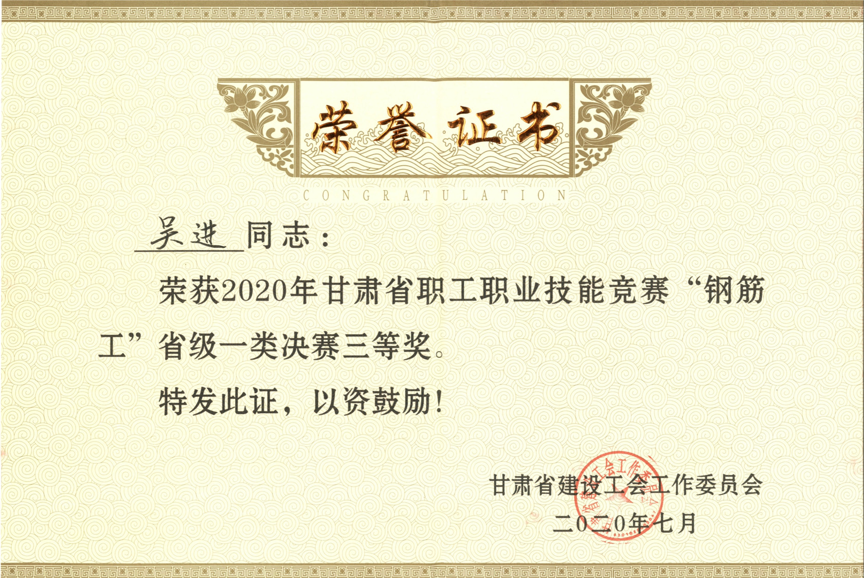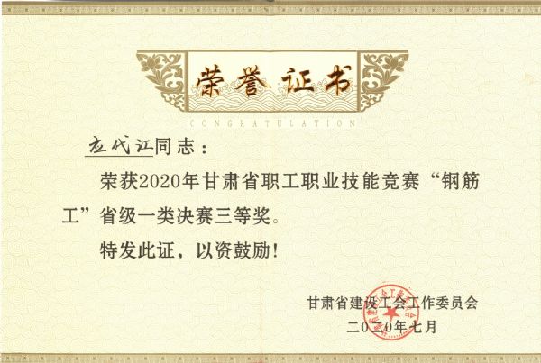 代表公司參加2020年甘肅省職工職業(yè)技能競賽“鋼筋工”大賽的吳進、應代江,榮獲省級一類決賽三等獎榮譽證書。