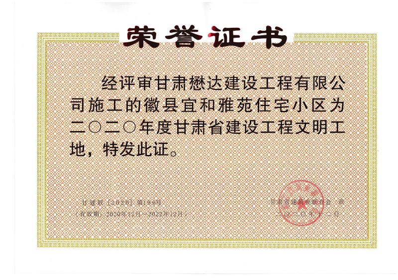 近日,公司承建的徽縣宜和雅苑項目被甘肅省建筑業(yè)聯(lián)合會表彰為2020年度甘肅省建設(shè)工程文明工地榮譽稱號。