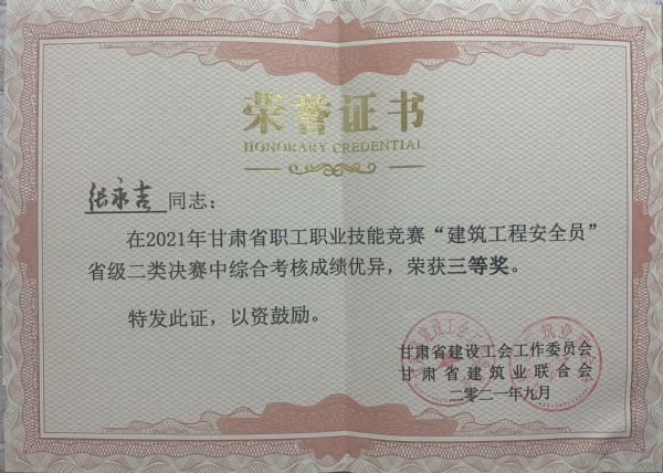 近日,2021年甘肅省職工職業(yè)技能競賽“建筑工程安全員”省級(jí)二類決賽在蘭州新區(qū)成功教育園項(xiàng)目舉行。公司選派安全員張永吉、張宏明參加競賽。