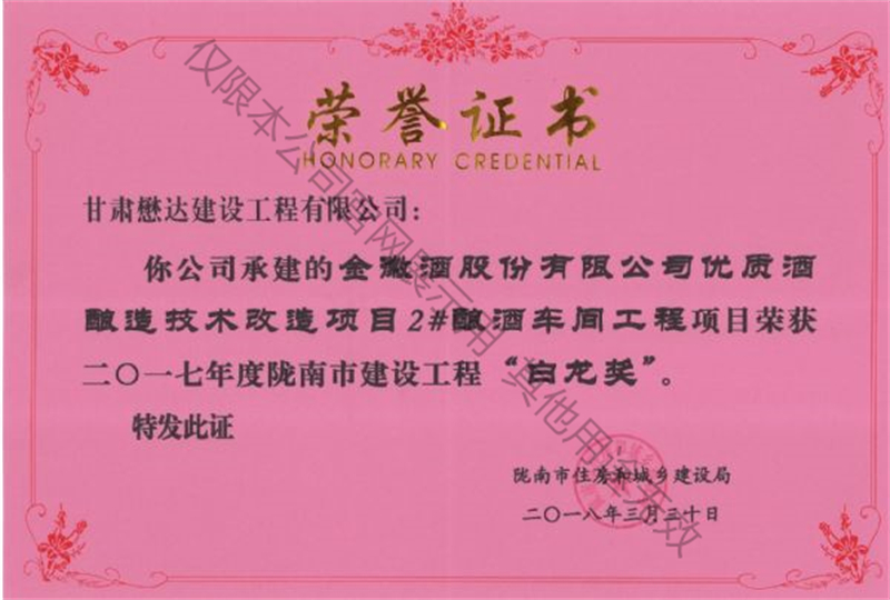 金徽酒股份有限公司優(yōu)質(zhì)酒釀造技術(shù)改造項(xiàng)目2#釀酒車間工程--2017年度隴南市白龍獎(jiǎng)