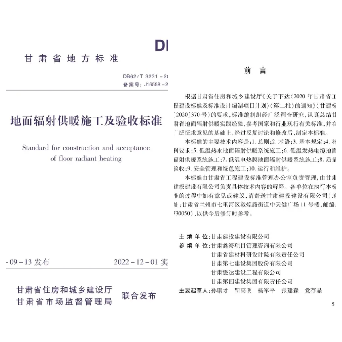 甘肅省住房和城鄉(xiāng)建設(shè)廳、甘肅省市場(chǎng)監(jiān)督管理局于近日發(fā)布公告,由公司參編的甘肅省地方標(biāo)準(zhǔn)《地面輻射供暖施工及驗(yàn)收標(biāo)準(zhǔn)》DB62/T 3231-2022 和《承插型輪扣式模板支架施工技術(shù)標(biāo)準(zhǔn)》DB62/T 3235-2023正式發(fā)布,分別于2022年12月1日和2023年6月1日起實(shí)施。
