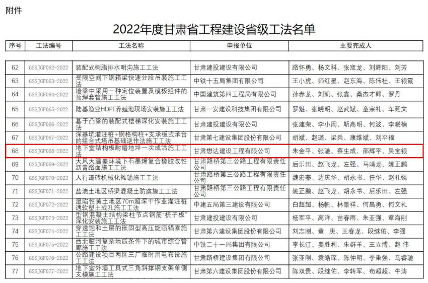 6月20日,甘肅省住房和城鄉(xiāng)建設(shè)廳下發(fā)文件《甘肅省住房和城鄉(xiāng)建設(shè)廳關(guān)于公布2022年度甘肅省工程建設(shè)省級工法的通知》(甘建質(zhì)〔2023〕127號),公司《地下室結(jié)構(gòu)板耐磨地坪一次成活施工工法》,根據(jù)《甘肅省工程建設(shè)工法管理辦法》(甘建工〔2016〕152號),省住建廳評審,經(jīng)公示無異議,獲評2022年度甘肅省省級工法。